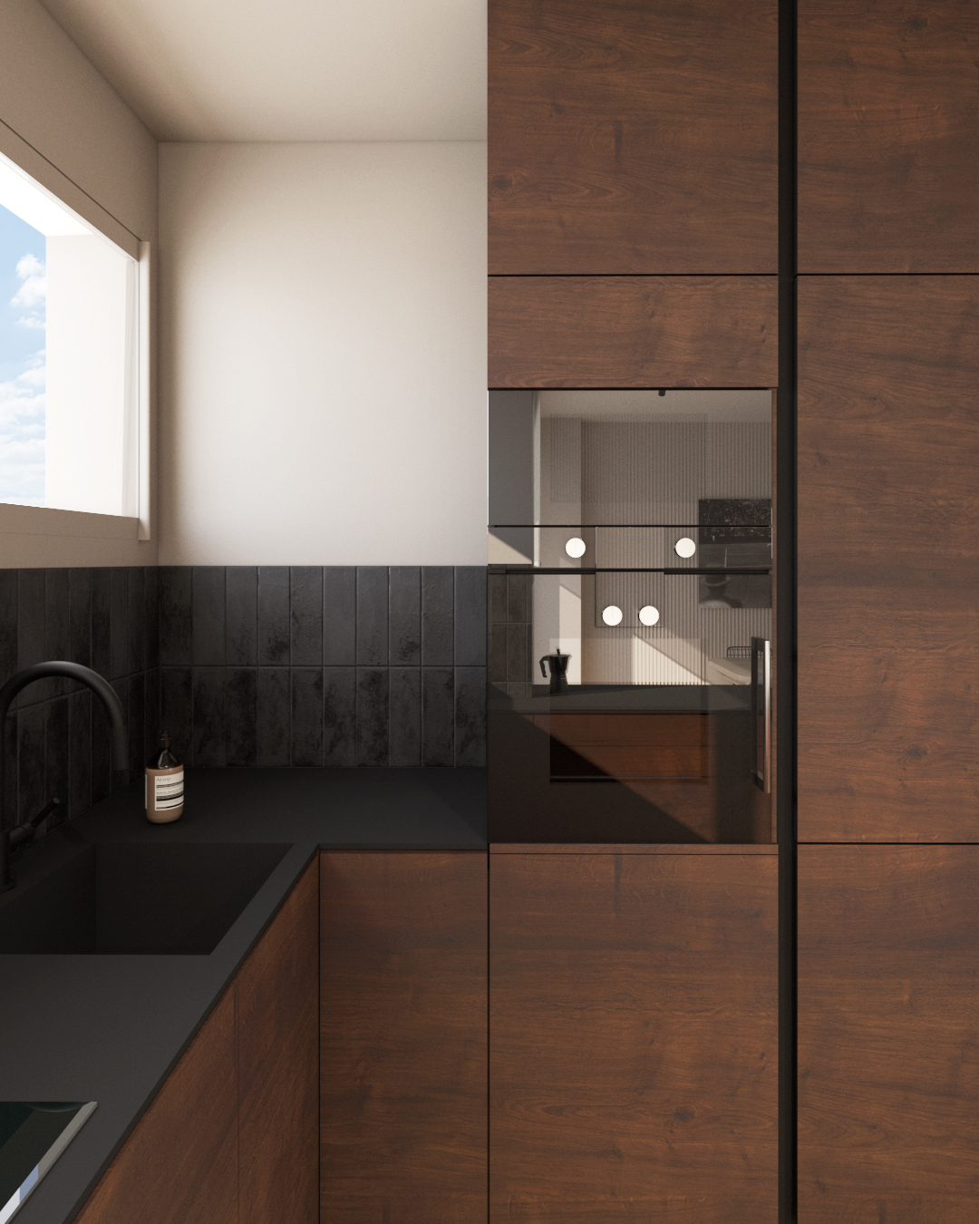 Nous avons repensé la distribution des pièces et choisi d’ouvrir la cuisine pour l’intégrer harmonieusement à l’espace de vie, tout en la définissant visuellement grâce à un jeu de matières et de lumière, créant ainsi une séparation subtile sans cloisonner.